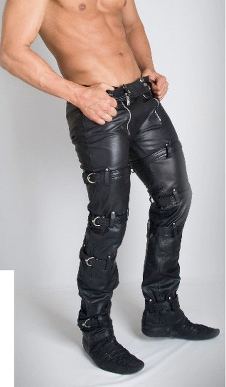 Experience the bold style of the Men's Black Genuine Leather Pants with Buckle Accents from Travel Hide. Crafted from premium leather, these pants feature an eye-catching design with buckles strategically placed for a modern and edgy look. Equipped with zipper pockets and a zipper closure, they offer practicality without sacrificing style. Perfect for those who appreciate distinctive fashion, these pants are versatile enough for both casual outings and special occasions, ensuring you stand out with confidence.