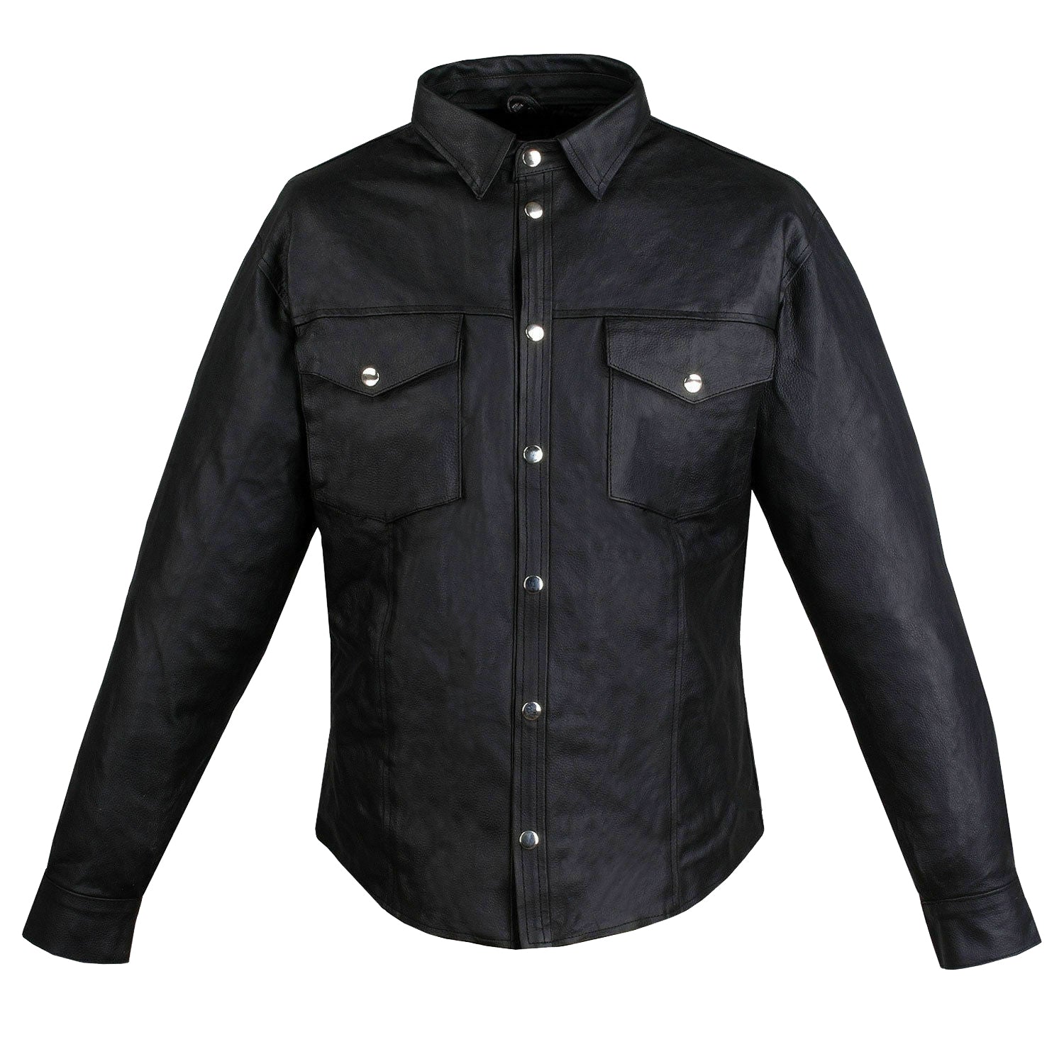Unleash your style with Travel Hide's Men's Black Leather Slim Fit Shirt. Crafted from genuine leather, this shirt features long sleeves, a sleek snap button closure, and two functional front pockets. The slim fit offers a contemporary look that seamlessly blends comfort and sophistication, making it an ideal choice for various occasions.