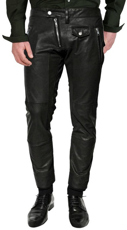 Men's Black Leather Ankle Length Slim Fit Pants from Travel Hide combine contemporary style with functional design. Made from premium leather, these pants feature a modern, slim fit that tapers at the ankle, highlighted by zipper cuffs. With a zipper and snap tab closure, they offer a secure fit while the multiple functional pockets add practicality. Ideal for making a stylish statement, these pants are perfect for both casual and formal occasions.
