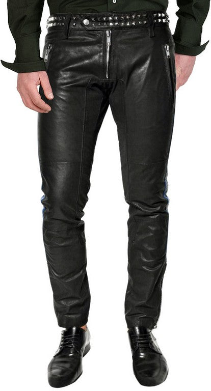 Discover the epitome of modern style with the Men's Black Leather Urban Slim Fit Pants from Travel Hide. Crafted from premium leather, these pants feature a sleek, slim fit that exudes sophistication. They are equipped with stylish zipper pockets for added functionality and a zipper and snap tab closure for a secure fit. Ideal for the fashion-forward man, these pants seamlessly blend contemporary design with practicality, perfect for both casual outings and formal occasions.