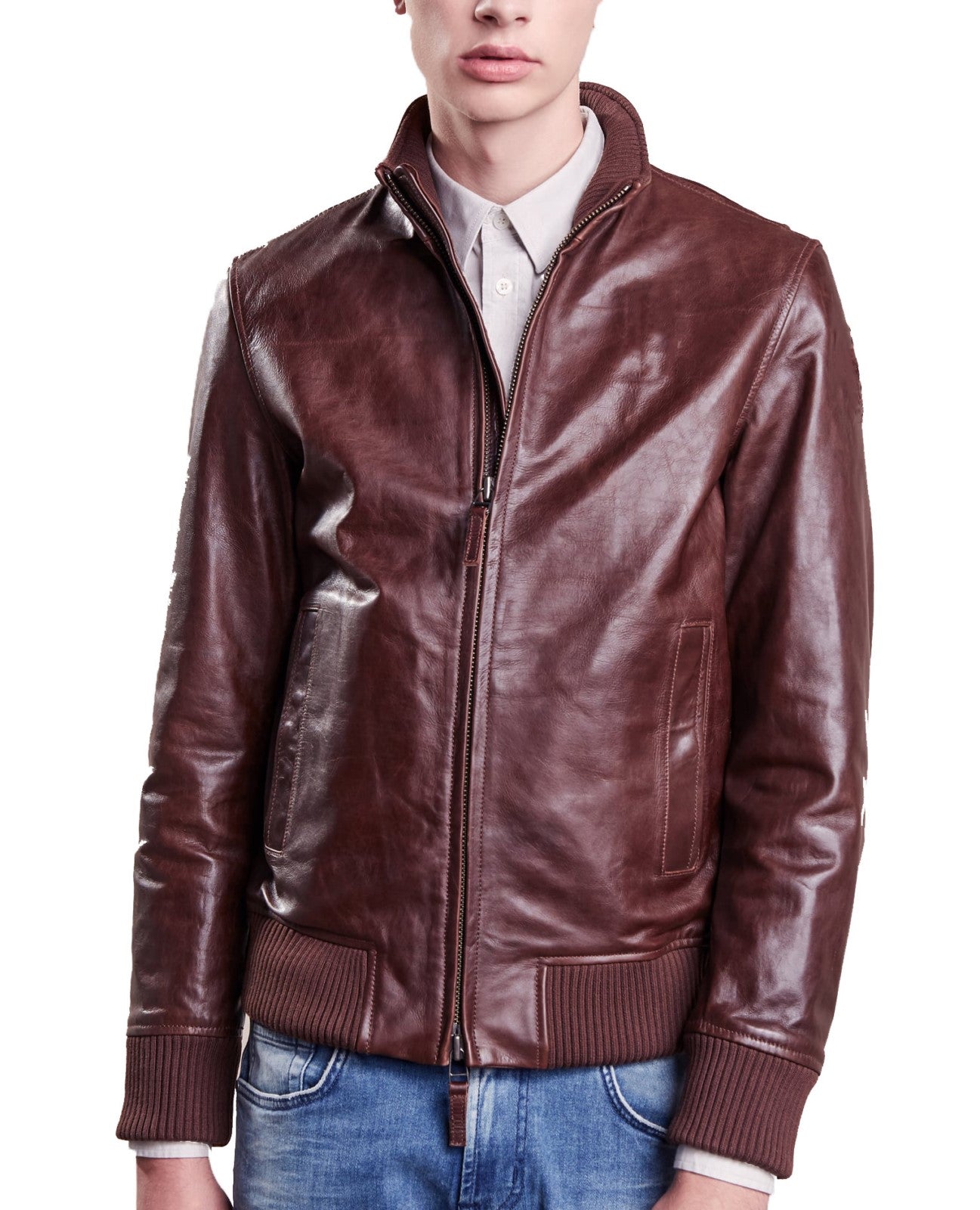 Step up your style game with our Men's Brown Leather Bomber Jacket, designed for both rugged durability and timeless appeal. Crafted from high-quality brown leather, this jacket features classic ribbed cuffs and hem, enhancing comfort and style. It's equipped with practical details like two side pockets and a sturdy front zipper closure. Perfect for any occasion, from casual outings to evenings out, this jacket effortlessly combines versatility with sophistication.