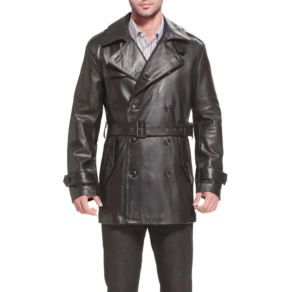 Embrace the essence of refined style with this men’s double breasted black leather trench coat from Travel Hide. Crafted from luxurious genuine leather, this coat combines classic tailoring with a modern edge. The double breasted button closure adds a touch of sophistication, while the waist belt allows for a tailored fit. Inside, the satin lining ensures a smooth and comfortable wear. Whether you're heading to a formal event or adding a stylish layer to your everyday look, this trench coat is designed to make a lasting impression.
