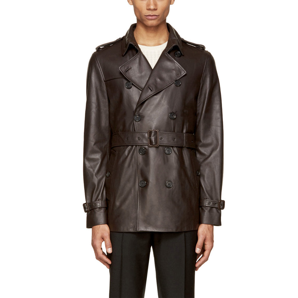 This brown leather trench coat is a versatile piece that effortlessly transitions from day to night. Pair it with a suit for a sharp, professional look, or wear it over jeans and a sweater for a more casual yet polished appearance. The combination of classic tailoring and unique detailing makes this coat a standout choice for any wardrobe.