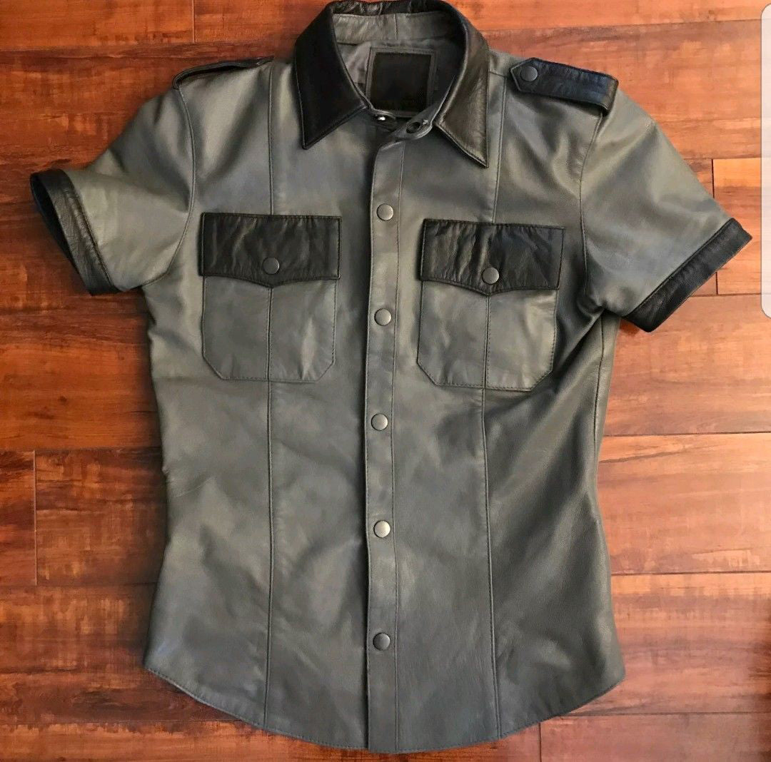 Unleash your inner style maven with this sophisticated gray leather shirt, crafted for the modern man. The slim fit ensures a sleek silhouette, while the spread collar adds a touch of class. Striking black stripes and shoulder loops complement the shirt, creating a unique and eye catching design. With a convenient snap button closure, this shirt effortlessly combines practicality with style, making it a versatile addition to any wardrobe.