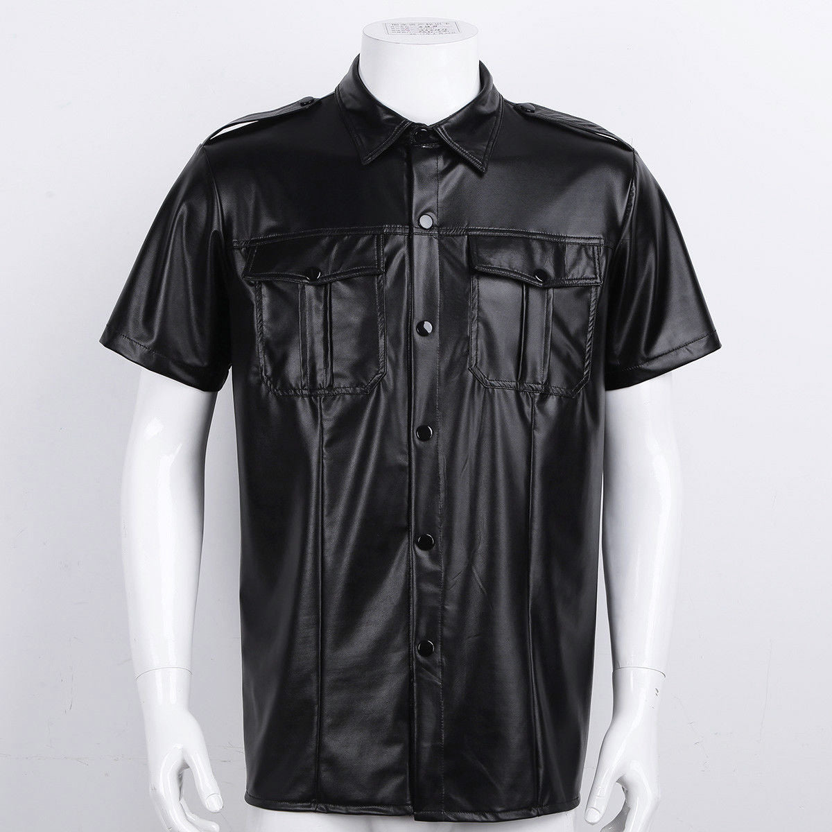 Elevate your wardrobe with this men's black leather short sleeve shirt, perfect for those who appreciate a blend of style and functionality. Designed with a flattering slim fit, this shirt features a spread collar that adds a dash of elegance. The snap button closure provides ease and convenience, while the two chest pockets offer practicality without compromising on style. Shoulder loops enhance the shirt's distinctive look, making it a standout piece for any occasion.