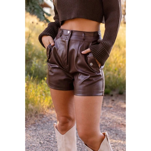 Pair these brown leather shorts with a tucked-in blouse and ankle boots for a chic daytime look, or style them with a cropped jacket and heels for an elevated evening outfit. Their rich color and tailored design make them a standout piece for versatile styling.