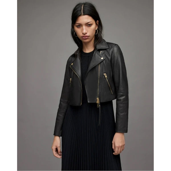 This cropped leather motorcycle jacket pairs effortlessly with high-waisted jeans and boots for a casual yet chic ensemble. Elevate your evening style by wearing it over a sleek dress. Its versatile design and premium lambskin leather make it an essential piece for any fashion-forward wardrobe.