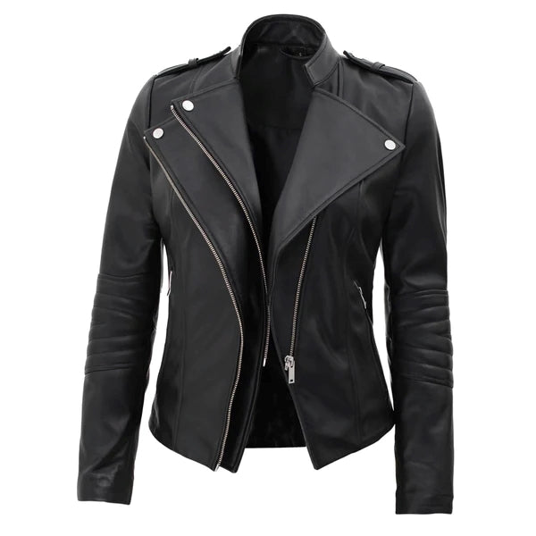 Unleash your bold side with this women’s lambskin leather motorcycle jacket. Crafted from genuine lambskin leather, it features a luxurious satin lining for a smooth and comfortable fit. Designed with a notched collar, shoulder loops, and a sleek zipper closure, this jacket exudes a confident, edgy aesthetic. Functional zipper pockets complete its classic biker appeal, making it both stylish and practical.