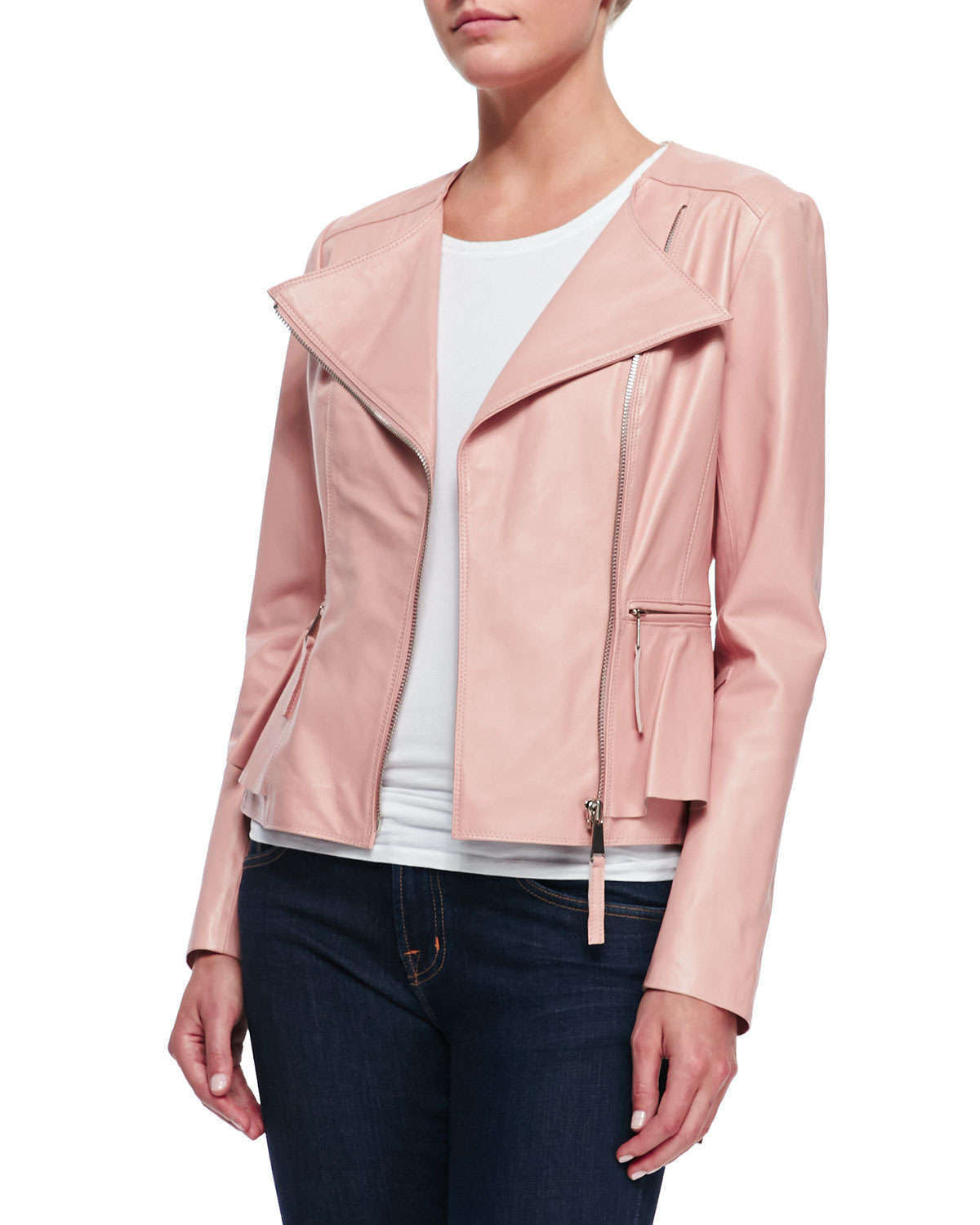 Embrace a touch of feminine charm with this baby pink leather jacket, designed to make a stylish statement. From Travel Hide, this jacket features a sleek zipper closure and practical zipper pockets for both elegance and functionality. The zipper cuffs offer a modern twist, while the notched lapel adds a classic, refined touch. Perfect for adding a hint of pastel sophistication to any outfit, this jacket is a versatile addition to your fashion collection.