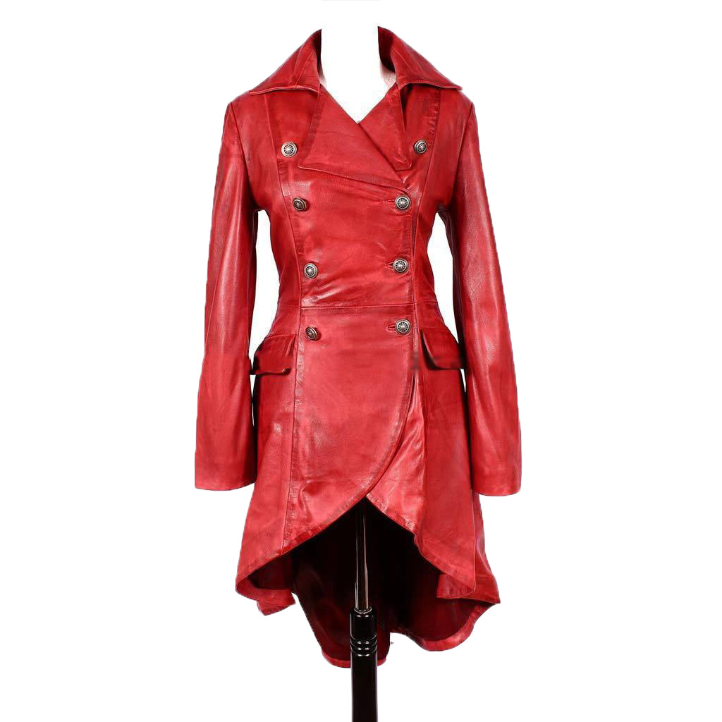 Style Notes: The Travel Hide Women's Double Breasted Red Leather Trench Coat makes a powerful style statement with its eye-catching red hue and sophisticated corset back detail. This coat effortlessly combines timeless elegance with modern flair, making it an ideal choice for formal occasions or adding a dramatic touch to your everyday ensemble.