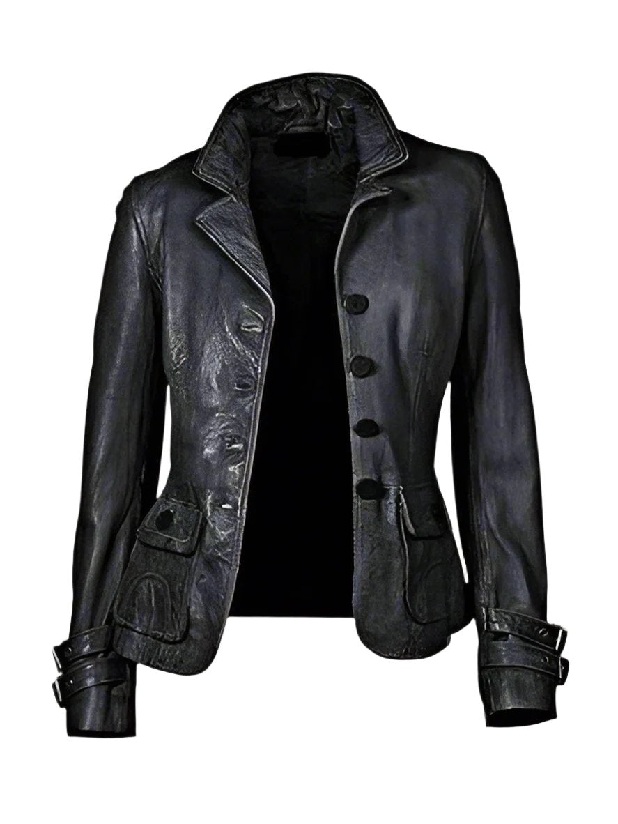 Embrace timeless elegance with this women’s black leather peacoat from Travel Hide. Designed with a classic four button closure, this jacket captures the sophistication of a traditional peacoat, reimagined in smooth black leather for a modern touch. The patch pockets add both charm and functionality, while the satin lining ensures a comfortable wear that drapes beautifully. Perfect for cool weather outings, this leather peacoat combines style and warmth, making it an essential piece for a refined wardrobe.