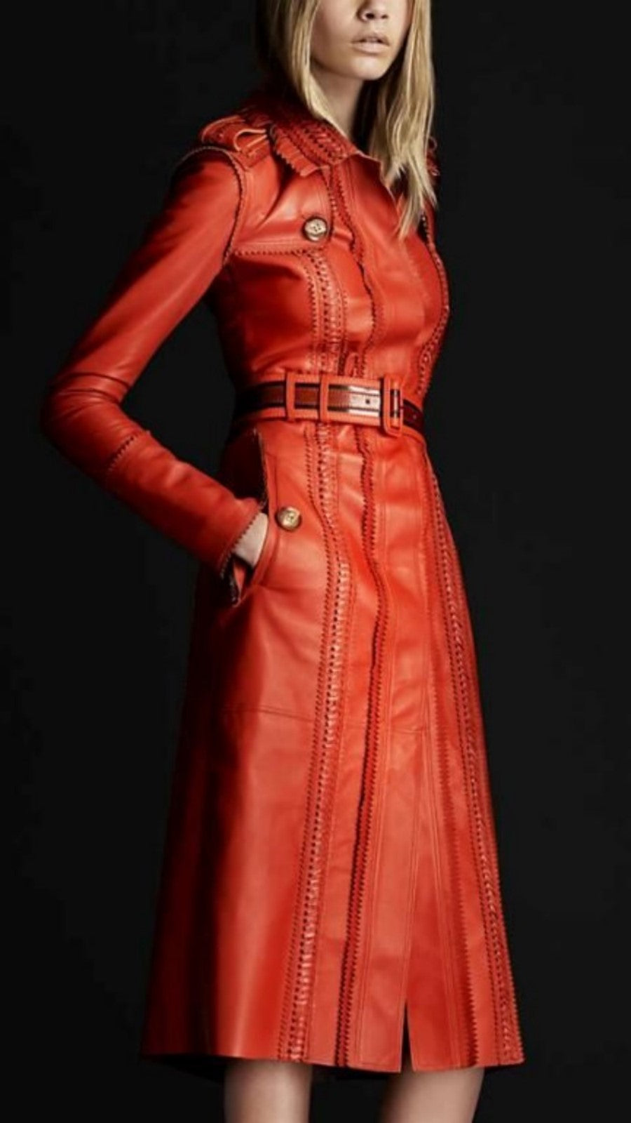 Brighten up your wardrobe with this eye catching orange leather trench coat, designed for the style savvy woman who isn't afraid to make a statement. Crafted by Travel Hide, this knee length coat features a classic button closure and a waist belt that cinches in for a flattering silhouette. The shoulder loops add a touch of military inspired detail, while two side pockets offer practicality without compromising style. Perfect for turning heads on any occasion, this trench coat is a bold addition to your collection.
