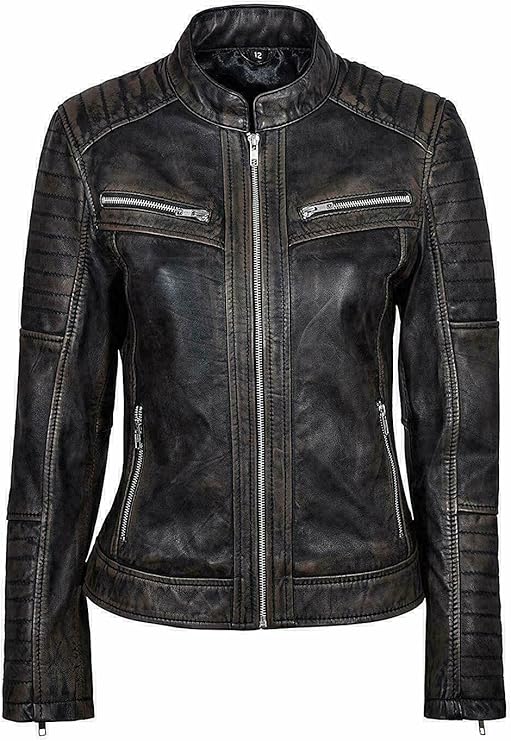 Travel Hide's Women's Distressed Black Leather Biker Jacket exudes timeless cool with its vintage inspired design. Crafted from genuine distressed leather, this jacket features a sleek zipper closure and practical zipper pockets. The rugged finish and classic biker details make it a versatile addition to any wardrobe, perfect for adding an edge to your look.